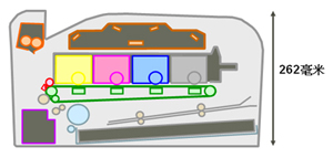 LBP5050 配備全新"橫向並列結構",使機身的總高度減至262毫米,其原理是將4支碳粉匣以水平排列放置去使得機身低矮。